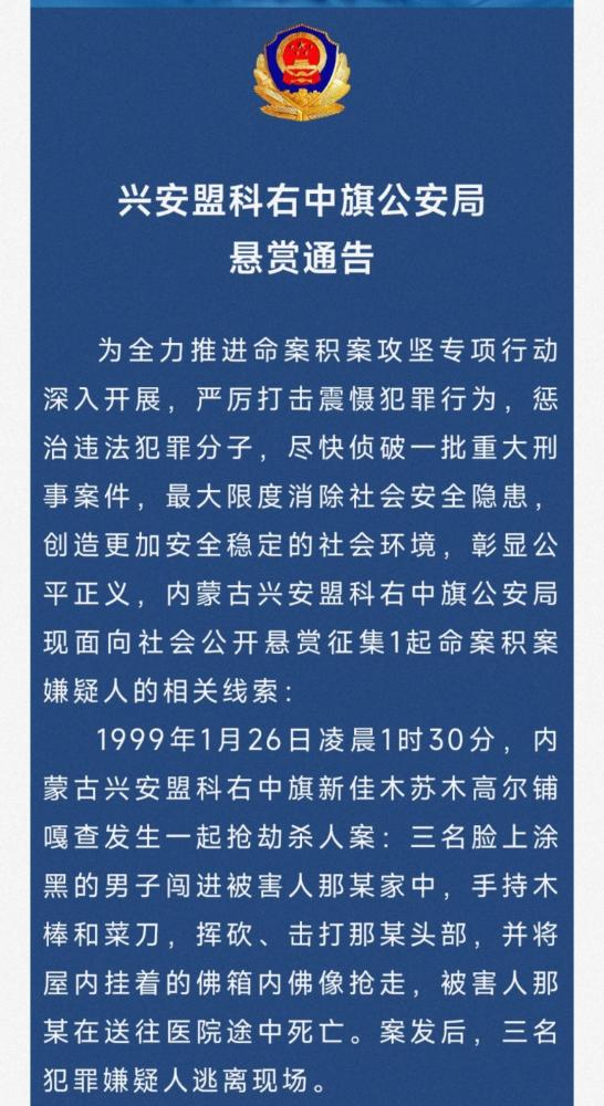 2022年5月,科右中旗公安局发布的悬赏通告却显示,这起案件尚未被侦破,警方仍在悬赏征集嫌疑人的相关线索。对提供重要线索破获此案或直接抓获犯罪嫌疑人的,公安机关将给予人民币10万元奖励。