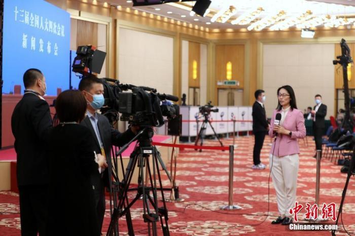 3月4日晚,十三届全国人大四次会议新闻发布会在北京人民大会堂新闻发布厅举行。图为新闻发布会开始前,央视记者在分会场梅地亚中心内进行直播。 中新社记者 蒋启明 摄
