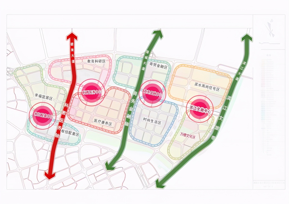 而以城市主次干道为经纬,以重要项目为辐射点,构建“一带、二轴、四中心”的规划布局,是其发展路径。
