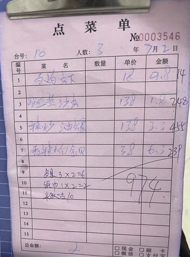 7月2日,广西的龙先生与两名朋友在北海市游玩时,经出租车司机介绍,到当地的侨港风情街某餐馆就餐。期间,三人点了白灼虾、粉丝蒸沙虫、辣炒油螺和香辣白金贝4道菜,以及一盅米饭,并使用了3套餐具和一包纸巾。在结账时,龙先生得知需支付974元餐费,“价格贵,份量也不对,感觉自己被‘宰’了。”