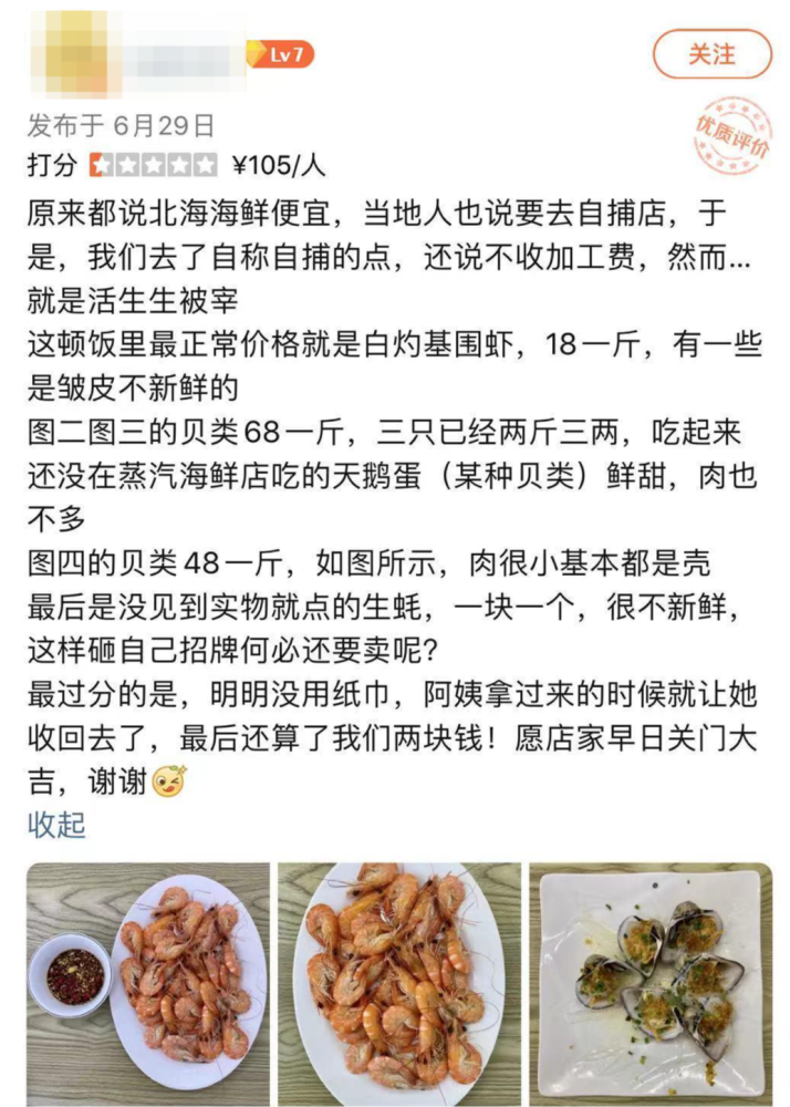 在大众点评APP上,红星新闻记者发现,有关该餐馆的评论里多人提到被“宰”、店“坑”。网友“米粒是吃货”在6月13日曾留言评论说,自己经出租车司机介绍到该餐馆就餐,仅点了2个菜(花蟹、百花鱼)却花费了598元。网友“Qzone”则在7月4日留言说,自己与朋友2人到该餐馆就餐,点了4个菜(面包蟹、油螺、虾、上汤娃娃菜)却花费了1300多元,“一个面包蟹一点肉都没有,油螺量也特别少,菜特别难吃。”
