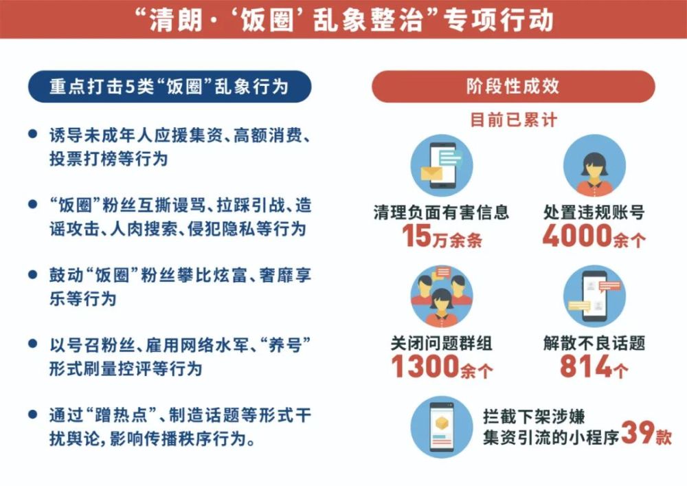 当前,“清朗·‘饭圈’乱象整治”专项行动正在深入开展。针对“饭圈”乱象的“应援打榜”等问题,中央网信办精准施策,督促网站平台进一步优化产品功能,升级管理策略,逐步压缩粉丝群体非理性追星空间,通过取消诱导粉丝应援打榜的产品功能、优化榜单规则、完善粉丝群圈管理、限制未成年人非理性追星活动等方式,强化榜单、群圈等重点环节管理。