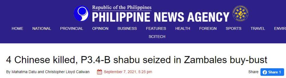 据菲律宾通讯社(PNA)等菲媒7日报道,4名中国公民在周二菲律宾当局开展的一次缉毒行动中死亡,行动中警方缴获了价值34亿菲律宾比索(约合4.4亿人民币)的毒品。