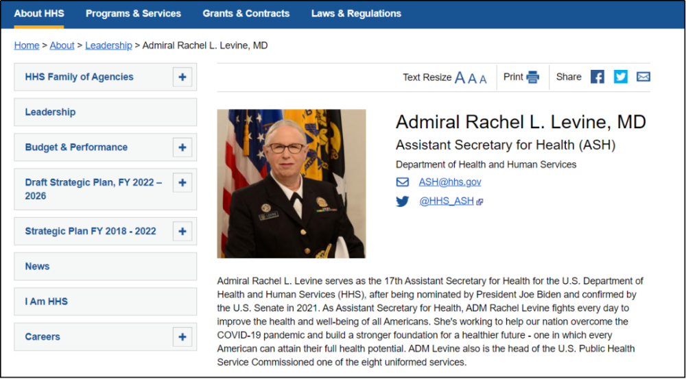 据美国卫生部官网介绍,自2021年,瑞秋·莱文在美国卫生部担任助理秘书长一职。10月19日,在美国总统拜登的提名下,莱文被正式授予美国卫生部下辖的纪律部队公共卫生服务团四星上将职衔。