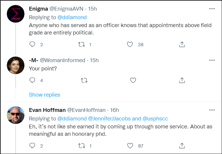 作为美国卫生部下辖机构,公共卫生服务团成员有不少也在美国卫生部门任职,他们身穿类似美国海军装的制服,采取类军事化管理,并按职务授予等同海军军衔的职务衔,莱文被授予的四星上将是该团最高指挥官的对应职务衔。