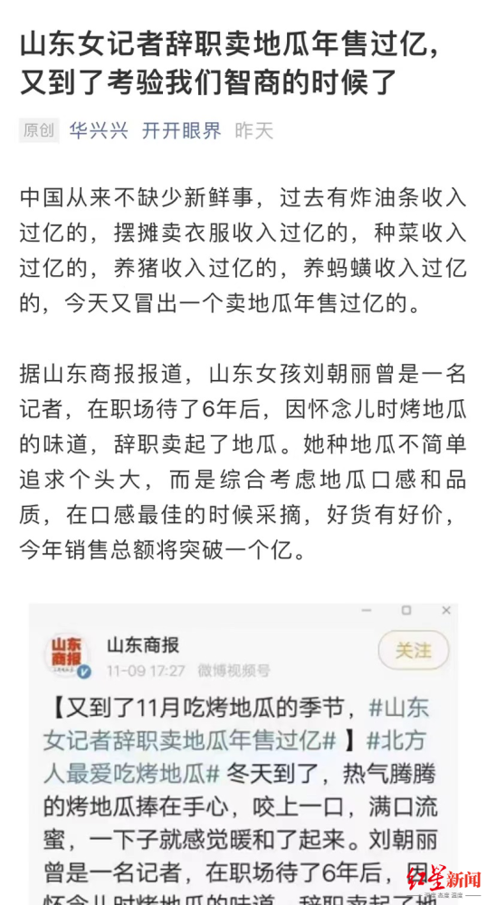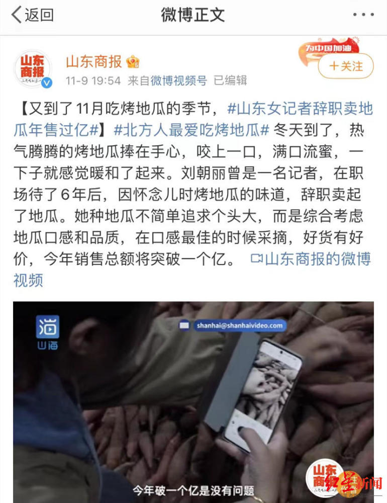 日前,有媒体报道称,前山东财经记者刘朝丽辞职后回乡创业卖地瓜,收益可观,“今年销售总额将突破一个亿”。
