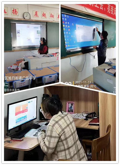 11月3日,防疫形势严峻停止线下教学,广信中学上午停课,下午就紧急组织教师进行“钉钉”软件功能介绍培训会。晚上更是全体领导、班主任加班加点,摸排学生情况“能否参加线上学习”、“线上学习是否存在困难”。夜深了,还有教师在调试设备,不断试播,确保“一课不落,一生不落”。