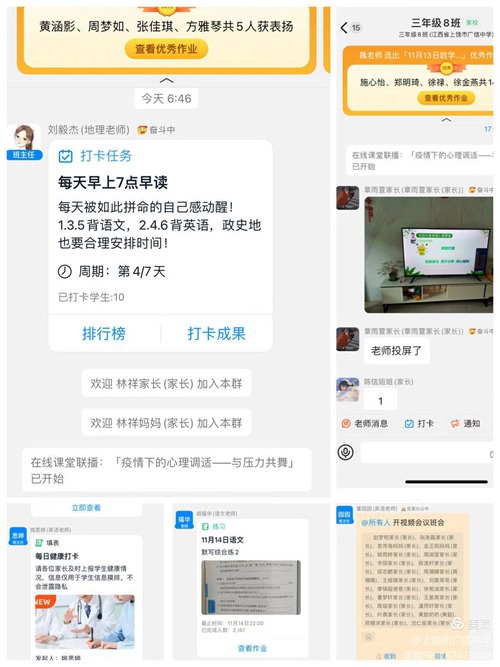 早读视频会议、课程签到打卡、作业上传批改……线上教学扎实开展。学校不仅为学生安排了各科丰富多彩的在线课程,还制定了详细而科学的线上学习时间和居家生活指导,促进学生全面发展。教师团队一丝不苟做好集体备课,确保线上课程的质量,同时严格落实“双减”政策要求,根据学科特点布置个性化分层作业。