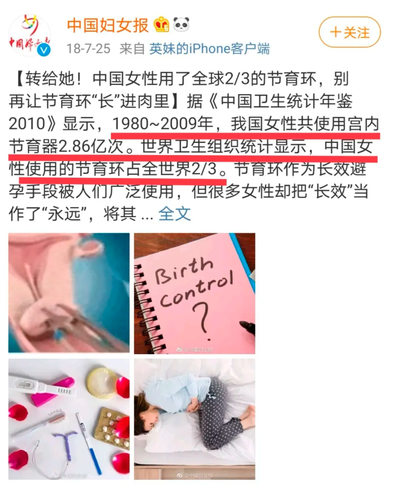 比如节育环在中国的确非常常见,普及率笑傲世界。据卫健委编撰的《中国卫生统计年鉴2010》,1980年起的30年间,我国女性使用宫内节育器一共2.86亿次。世卫组织的统计则显示,中国女性使用的节育环占全世界三分之二。