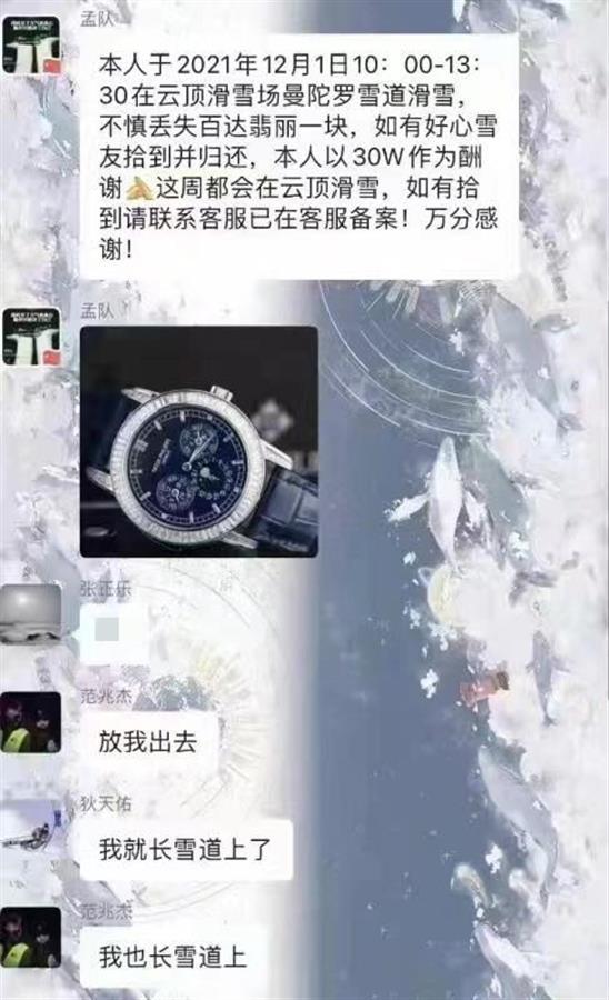 据网传截图显示,有网友称自己于2021年12月1日在云顶滑雪场曼陀罗雪道滑雪,不慎丢失百达翡丽表一块,如有人拾到并归还,愿意以30万元作为酬谢,并附上了丢失手表的照片。
