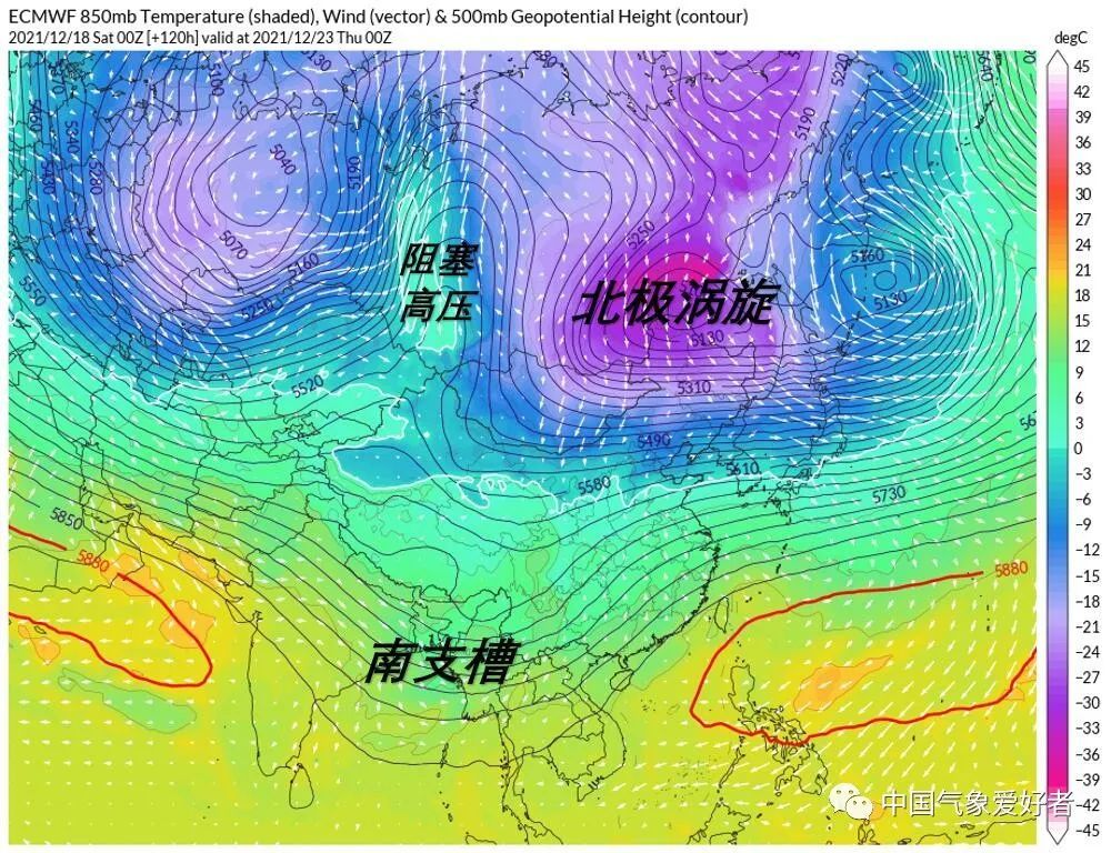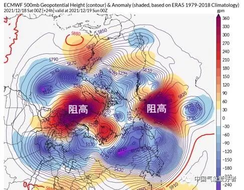 最新的气象监测数据显示,北太平洋和冰岛附近各出现了一个强烈的阻塞高压,位势异常偏高到“发紫”,成为了搅动西风带的重要信号。在它们的连环逼迫和能量传导下,从12月24日起,北极涡旋将告别家乡,逐渐南迁向我国东北靠近。
