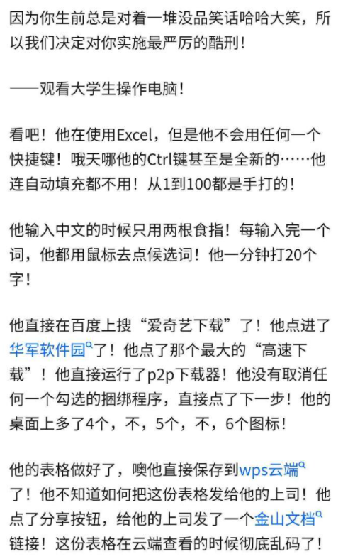 前段时间,知乎用户@卡戎 将大学生使用电脑时闹出的种种笑话收录到了一起,设计了史上最严厉的酷刑之—— “观看当代大学生操作电脑”。