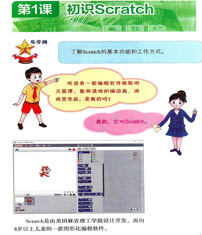 在更高年级的教材中,甚至已经出现了Scratch这样的图形化编程软件介绍: