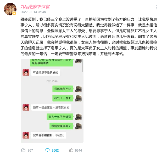 上游新闻注意到,在男主更新发布的微信对话截图中,与他对话的人发出了“还有一些是家里人逼着我发的”“我消息都被控制,不敢发”的信息。