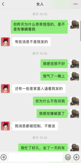 男主表示,自己太相信微信上的消息,全程照顾女主人的感受,想要息事宁人。但是可能那并不是女主人的真实感受。翻看了这两天的聊天记录,突然觉得自己很傻。他说,女主人性格很弱,“这时候我仅经过几条被操控了的信息就选择了息事宁人”。
