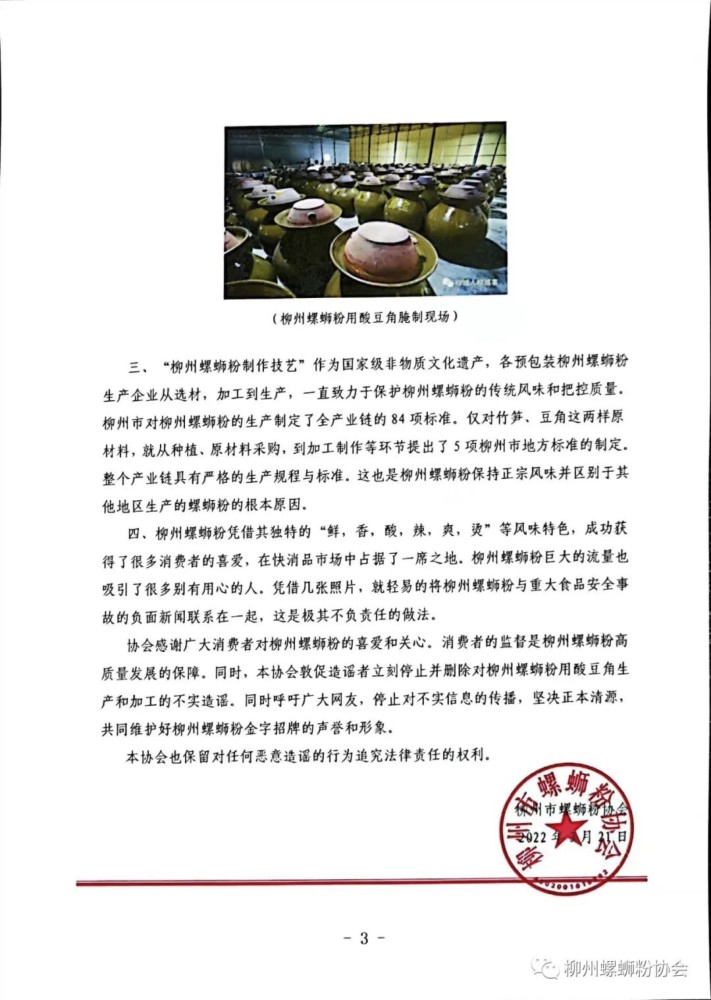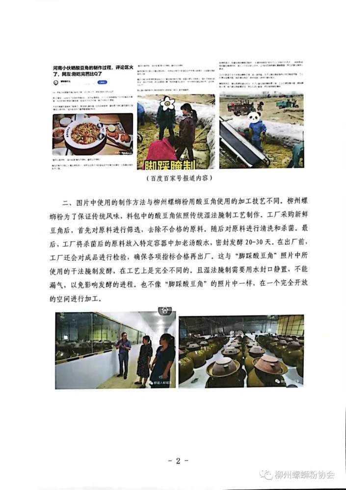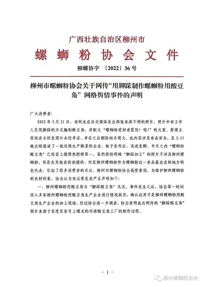 3月22日,柳州螺蛳粉协会官微发布关于网传“用脚踩制作螺蛳粉用酸豆角”网络舆情事件的声明:柳州螺蛳粉用酸豆角与“脚踩酸豆角”无关。事件发生之后,协会第一时间深入多家柳州螺蛳粉用酸豆角生产企业进行情况核实,确认这并不是柳州螺蛳粉用酸豆角生产企业的加工现场。经过协会进一步调查,协会查明此次网传的“脚踩酸豆角”图片来源于百度百家号上曝光的河南酸豆角工厂的制作过程。