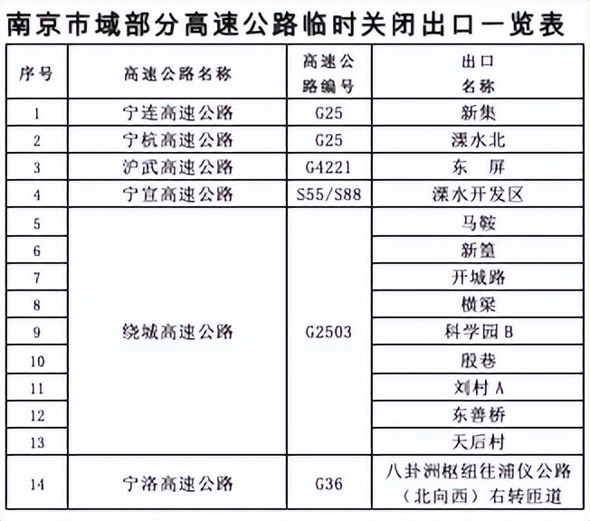 5、G2503 南京绕城高速,关闭马鞍、新篁、开城路、横梁、殷巷、东善桥、天后村等9个出口