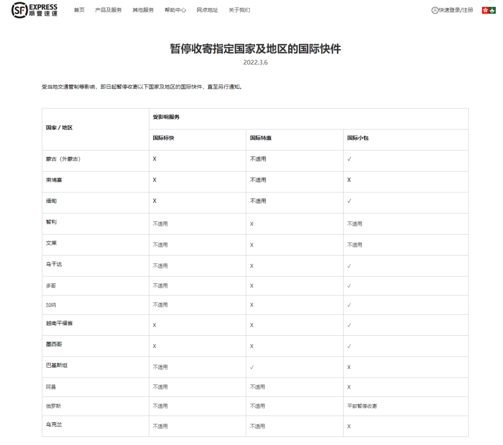 另外,受当地交通管制等影响,顺丰自3月6日起暂停收寄俄罗斯、乌克兰、柬埔寨、智利、文莱等国家及地区的国际快件。