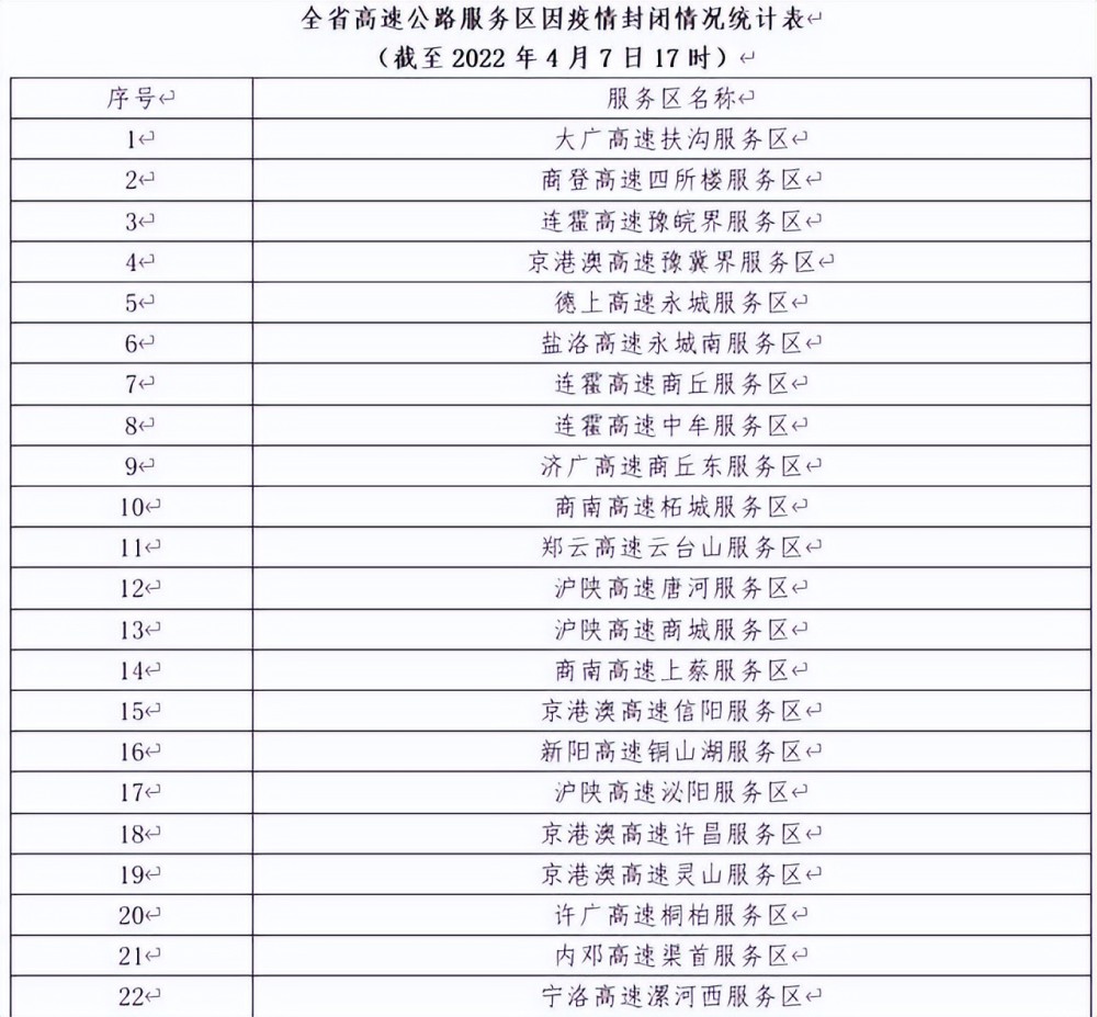 4月8日,记者从河南高速公路相关部门获悉,根据当地疫情防控指挥部要求,大广高速扶沟服务区、连霍高速商丘服务区、京港澳高速信阳服务区等河南37个高速服务区封闭,禁止车辆驶入。