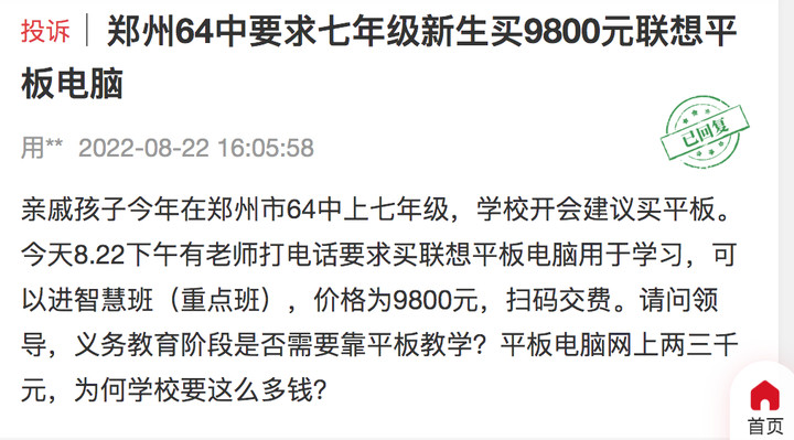 近日,郑州市民投诉称,郑州市64中要求七年级新生买联想平板电脑用于学习,可以进智慧班(重点班),价格为9800元,扫码交费。义务教育阶段是否需要靠平板教学?平板电脑网上两三千元,为何学校要这么多钱?