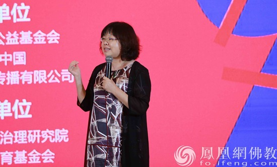 鄞州银行公益基金会理事长、宁波市善园公益基金会秘书长陈耀芳做了题为“以善园为例,看慈善组织参与社会治理的多渠道性”的专题演讲(图片来源:凤凰网佛教 摄影:林恩)