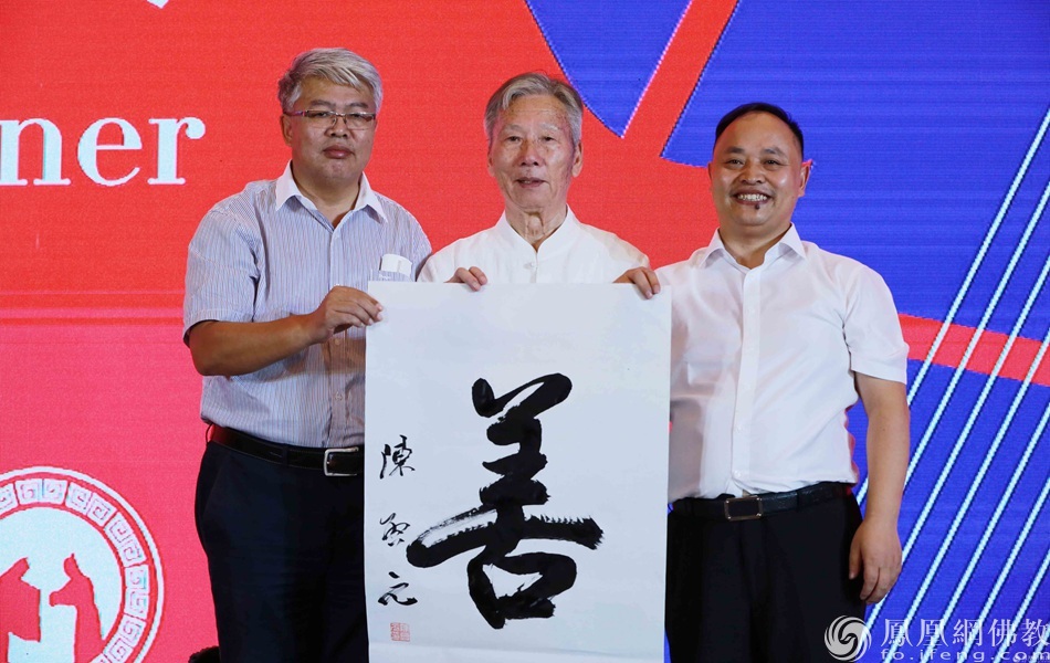 中国书法家协会会员、宁波市书法家协会名誉主席陈启元老先生为活动起首笔。(图片来源:凤凰网佛教 摄影:林恩)