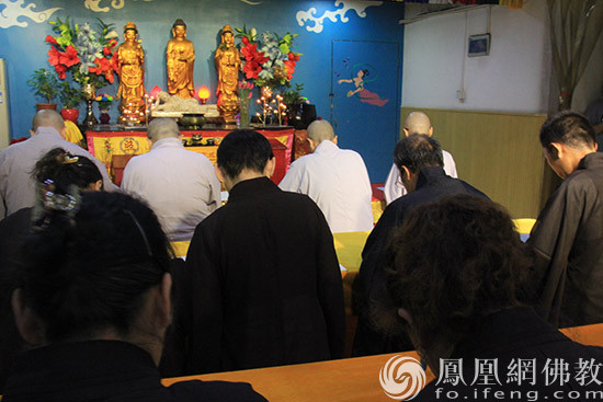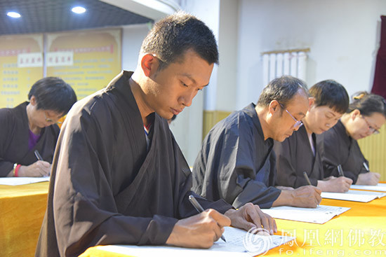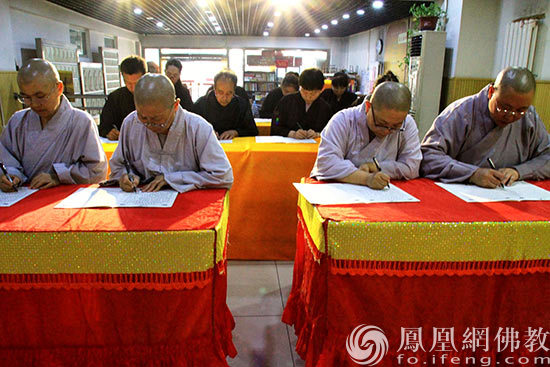 常住法师带领众居士在佛前抄写心经,供养佛菩萨。(图片来源:凤凰网佛教 摄影:果朝)