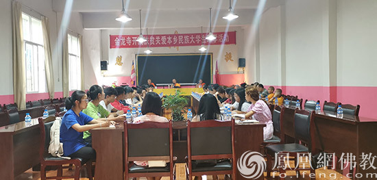 合影留念(图片来源:凤凰网佛教 摄影:云南沧源金龙寺) 2019年8月4日,云南沧源金龙寺开展扶贫关爱本乡民族大学生捐资助学活动,共资助勐角民族乡大学生56人,圆了少数民族学子的大学梦。 云南沧源金龙寺住持祜巴提卡达希长老在沧源自治县佛教协会培训中心教室,围绕“散播慈爱”、“心怀感恩”、“行善培福”、“付出努力,梦想成真”进行随喜开示。并教育和引导大家,要恭敬与谦让,知足并感恩,若想被人尊重,先去尊重别人;若想被人理解,先去理解别人;若想被人宽容,先去宽容别人。避开邪念,多做善事。 云南沧源金龙寺住持祜巴提卡达希长老鼓励新时代大学生孝敬父母师长,珍惜上大学的机会,努力提升文化修养与道德水平;同时也要学习佛教经典“诸恶莫作,众善奉行”。将佛法的思想精髓与日常生活学习、做人做事结合起来。希望大学生设立远大理想,勤奋刻苦学习,脚踏实地,奔向未来,不要畏惧困难,不能半途而废,要懂得无私奉献,知恩感恩,做一个有益于社会、有益于国家、有益于佛教、有益于民族、有益于众生的贤善之人,在将来成才之际,在力所能及之时,能积极帮助需要帮助的人,用实际行动回报社会、家乡与国家。 随后,大家围坐在一起,分享即将上大学的憧憬和感受,相互交流心得体会。大家纷纷表示以后一定好好学习,不断提高自身素质和水平,存好心、说好话、行好事、做好人,用实际行动尽一切努力,去争取成功。在此次的交流学习中,大学生们获得了更多的动力去迎接新学期的到来。 最后,云南沧源金龙寺全体僧众用巴利语祝福大学生们身心健康,拥有明亮的智慧,身边充满善知识,一切随愿所成,圆满无边。