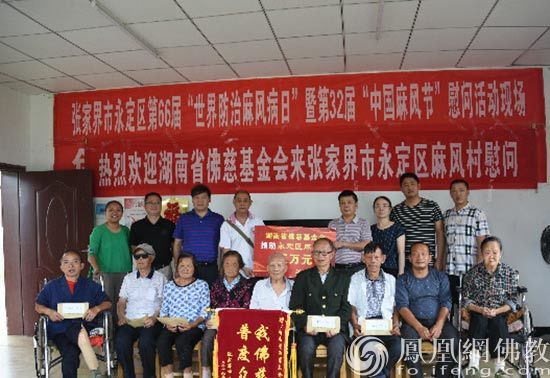 湖南佛慈慰问张家界永定区麻风村麻风病友(图片来源:凤凰网佛教 摄影:湖南佛慈) 2019年7月12日上午,受中国佛教协会副会长、湖南省佛教协会会长、湖南省佛慈基金会理事长圣辉大和尚委派,湖南省佛慈基金会秘书长周仲山、常务副秘书长陈旭,湖南省佛慈基金会工作人员李长辉等一行,来到了位于张家界市永定区的麻风村,慰问居住在此已经近50多年的15位无家可归的残障麻风病友。 出席本次捐赠活动的还有张家界永定区委统战部副部长欧飞,湖南省疾控中心麻风病防治科副科长陈欢,张家界永定区卫健局副局长杨兵,张家界永定区疾控中心书记王铸,张家界永定区疾控中心副主任覃锐,张家界永定区疾控中心工会副主席符自强。 尽管在当地政府和社会各界的关系和帮助下,病友生活得到了极大改善,但由于修建“麻风病康复中心”投入较大,后期康复所需要的生活物资如电视、冰箱及康复者使用的轮椅、假肢等,尚无法完全满足需求。为了解决这一资金缺口,张家界市永定区疾控中心特向湖南省佛慈基金会提出了请求资助的申请。至此湖南佛慈2019救灾帮困助学慈善行启动之际,特决定再次向张家界市永定区麻风村捐赠善款5万元。希望能够为这些无法回归城市生活的病友送去一份关爱和温暖。 永定区是张家界市政府所在地,全区土地总面积2172平方公里,总人口47.87万人,属全省麻风病高发区县,截止目前,全区累计发现麻风患者892例,存活276人,现症患者7例,Ⅱ级畸残68例。张家界市永定区麻风村始建于1953年,距城区15公里,位于海拔654米的麻空山上,70年代中期最多收治麻风患者203人,目前仍居住有治愈的畸残病友15人。2016年9月,永定区政府投入150余万元,在原麻风村旧址新建“麻风病康复中心”,居住面积600平方米,设有麻风病康复室,娱乐室,医护室等。