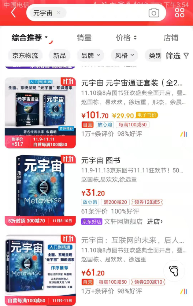 而元宇宙相关书籍在电商平台、知识付费平台上,也取得了不错的销售成绩。红星资本局搜索发现,《元宇宙》《元宇宙通证》套装(全2册)在京东悦己新势力好书趋势榜上位列第11,收获了超1万条评论。该书在罗振宇创立的得到APP上提供电子书,会员可免费阅读。