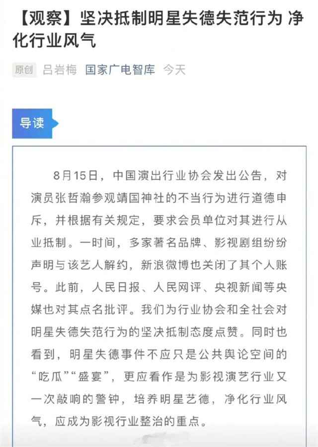 昨日,中纪委和广电都发声了,广电发文称,要严格执行演艺人员行为准则,绝不为违法失德艺人提供出镜发声的机会。要对失德失范行为零容忍。这也意味着向吴亦凡霍尊,张哲瀚这样的劣迹污点艺人再无可能。同时,广电也希望相关部门监管更加严格。中纪委也发文称,这段历史不能容许“无知”,要提高艺人的准入门槛,把劣迹艺人都挡在门外,也希望广大从艺人员以此为戒。