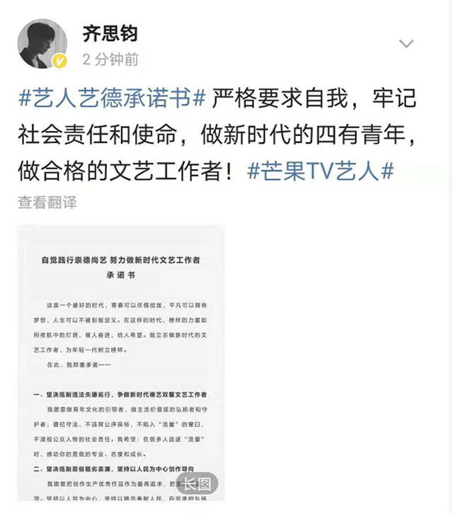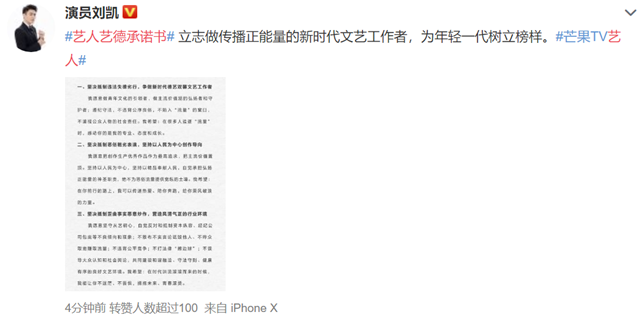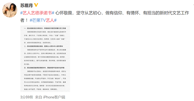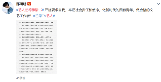 参加过《牛气满满的哥哥》的齐思钧,出演过《你好旧时光》的演员陈鹏万里也转发承诺,参加过《创造营》的邵明明承诺要严格要求自我,牢记社会责任和使命。苏眉月,演员陈米麟,完颜洛绒,李莎旻子也纷纷表态。只要是芒果旗下的艺人,无论是小有名气的杨烁还是其他刚签约的艺人,都转发了这份承诺书表明态度。
