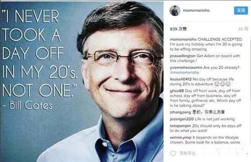 他把比尔盖茨的话贴到ins上激励自己:“我20岁到29岁期间,从未放过一天假”。