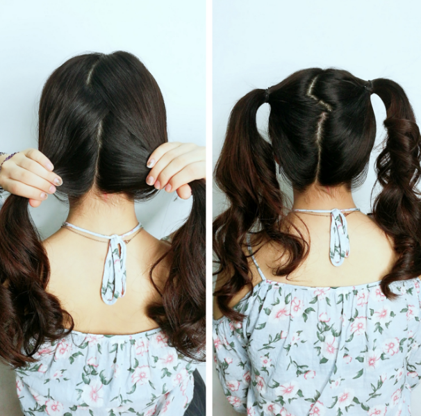 将头发从后脑分为左右两个发区并束成马尾辫,曲折的分缝可增加自然感